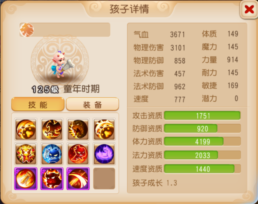 这位狮驼岭孩子在培养完全的情况下,不仅攻击资质高达1751点,面板物理伤害更是达到了3101点。