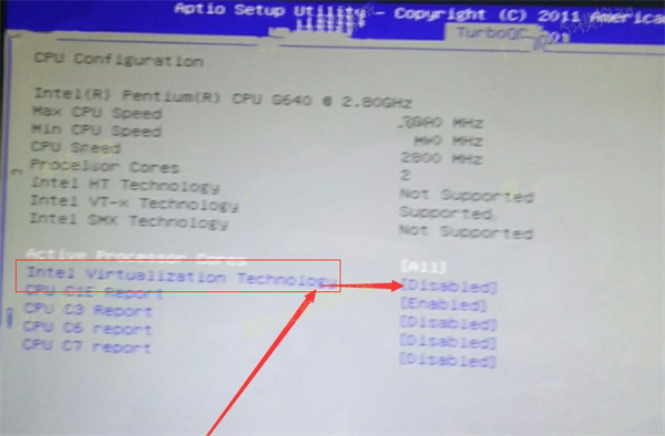 1、进入BIOS页面后,找到“TurboOC”——“CPU Configuration(处理器配置)”——“Intel Virtualization Technology(英特尔虚拟化技术)”选项,把“Disabled”都修改为“Enabled”或者“禁用”修改为“启用”;
