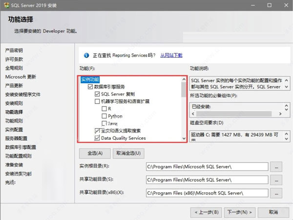 7、在软件安装功能选择界面中,请用户根据自身需求,直接勾选对应的功能(没必要全部勾),选本案例只勾选了必备功能,安装完成后还是可以添加功能的