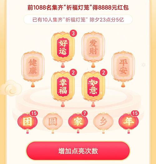 祈福灯笼共有“健康、好运、平安、发财、幸福及如意”六大新年愿望,集齐一套祈福灯笼可获得祈福红包的开奖机会