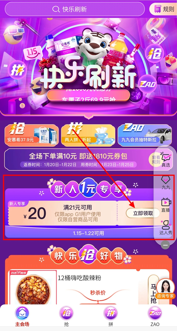 2、进入到首页后,我们可以在app的中间部分看到“新人1元专享”。