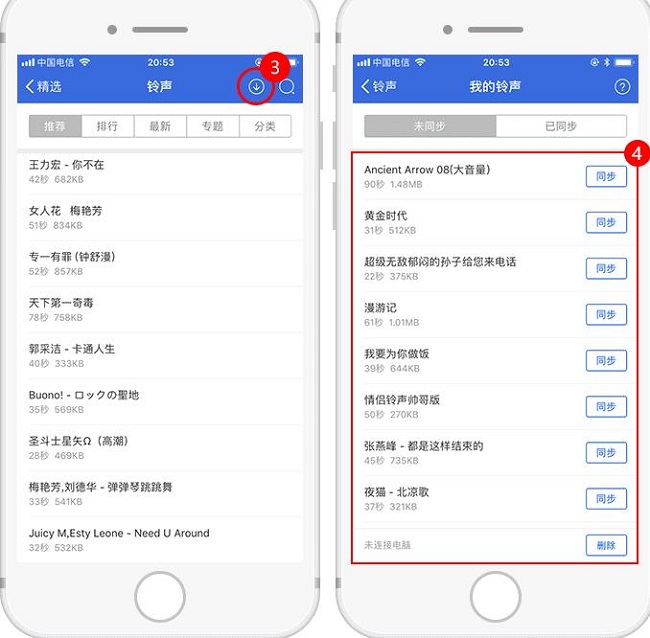 1、在设备上打开爱思助手移动端的“铃声”界面,试听并下载您喜欢的铃声