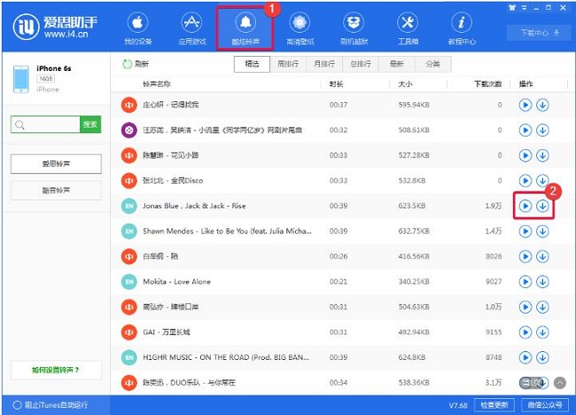 1、打开爱思助手PC端,将设备连接到电脑,在“酷炫铃声”资源中,点击铃声右边的下载按钮,下载该铃声并导入到设备中