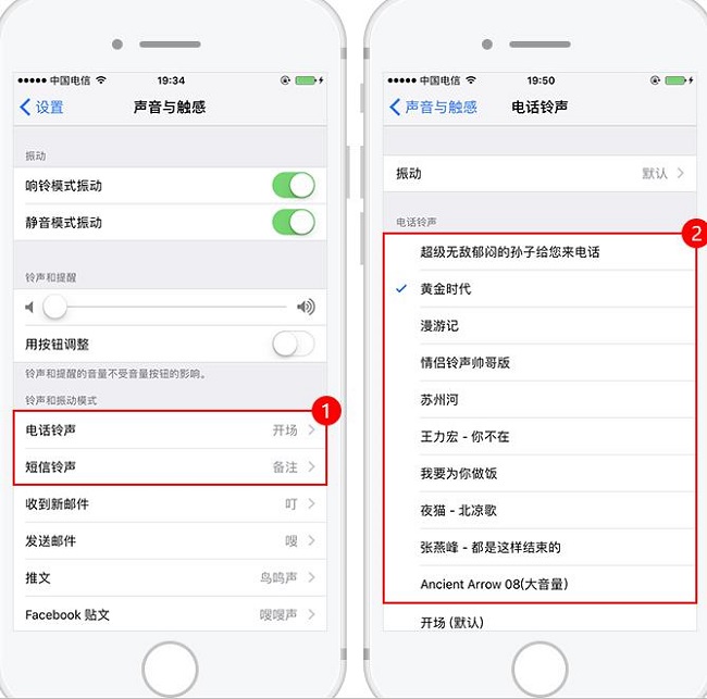 在设备上依次打开“设置 -> 声音(或声音与触感) -> 电话铃声或短信铃声”,在列表中选择铃声即可