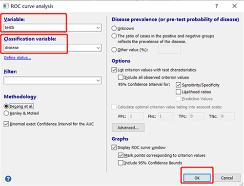 在ROC curve analysis对话框中,Variable框中选择testb,Classification variable框中选择disease,其他默认即可,最后点击OK。