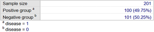 下表给出了总样本量、disease=0组的频数(百分比)、disease=1组的频数(百分比)