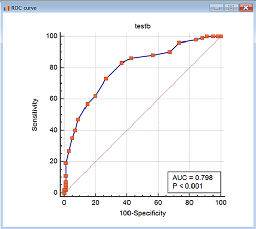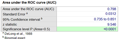 下表给出了ROC分析的结果,ROC曲线下面积AUC=0.798,95%可信区间为0.735-0.851,z值=9.546,p值<0.0001.