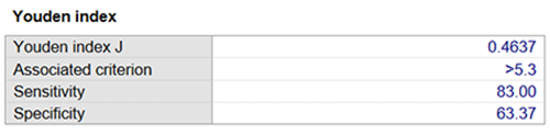 下表给出了最佳cut-off值为>5.3,此时Youden指数最大为0.4637,灵敏度为83.00%,特异度为63.37%。