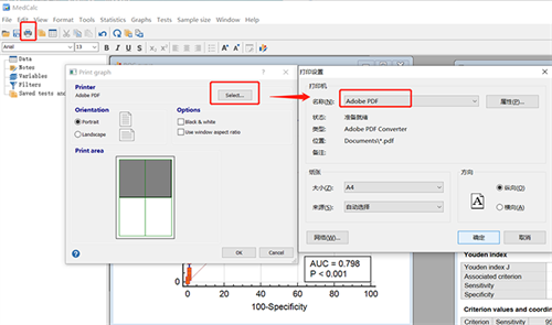 选中ROC curve图,点击打印机图片,然后点击Select,选择Adobe PDF,点击确定即可,之后再AI中进行简单编辑就可以使用了。