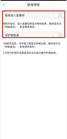 3、第三步:在隐身特权设置界面将【隐身进入直播间】右侧的虚拟键打开就可以了。