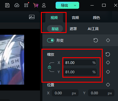 4、选中视频右侧可以看到视频编辑功能,可以鼠标拖动“缩放”里数据调整视频比例。