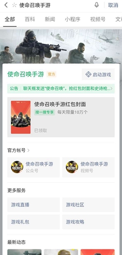 2、在搜一搜中输入使命召唤手游,页面中的第一条就是红包封面的活动地址。