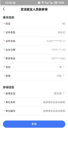 3.找到“医保业务办理”,点击“灵活就业人员新参保”。选择常住地医保区划(单位名称和单位编号在选取地区后自动获取)。