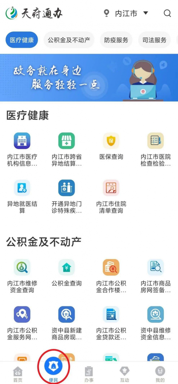 点击左下角第二个选项“便民”