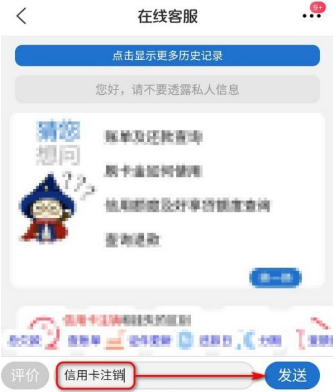 进入在线客服主界面,在信息框内输入:信用卡注销,然后点击发送。