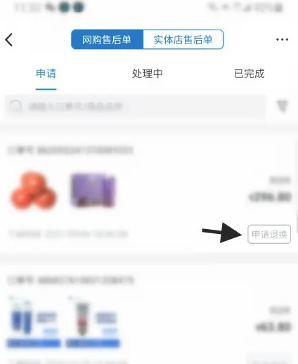 最后,进入选择网购售后单选择商品,点击上面的申请退换选项。