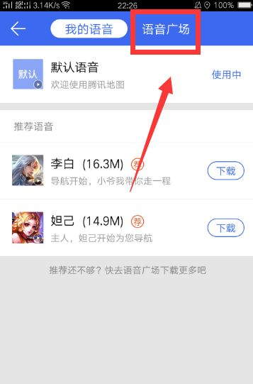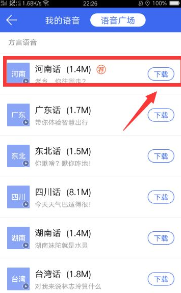 【语音广场】的页面,在方言语音这一项,选择你家乡的方言,点击“下载”这一项。