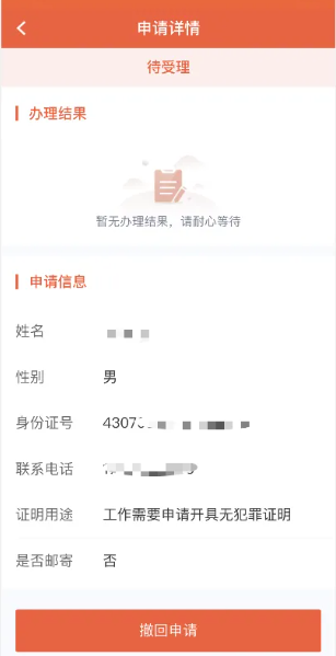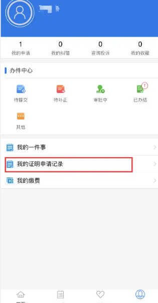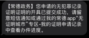 ⑥申请提交后会收到申请成功的短信,然后进入“我的-我的申请”记录页面查看证明申请进度