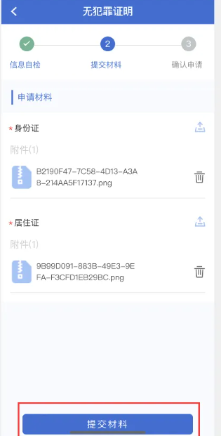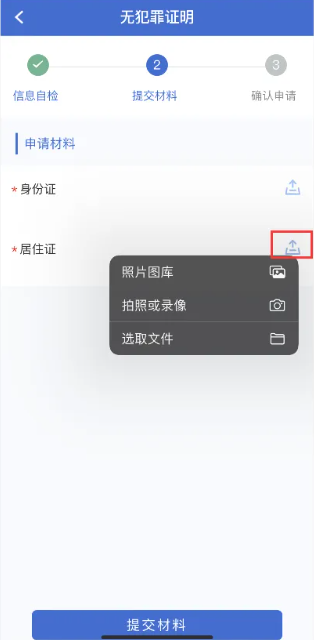 ④进入提交材料页面,材料提交方式有三种,分别为选择证件图片、拍摄证件照片、选取证件文件,可根据需要自行选择。提交材料完成后点击“提交材料”