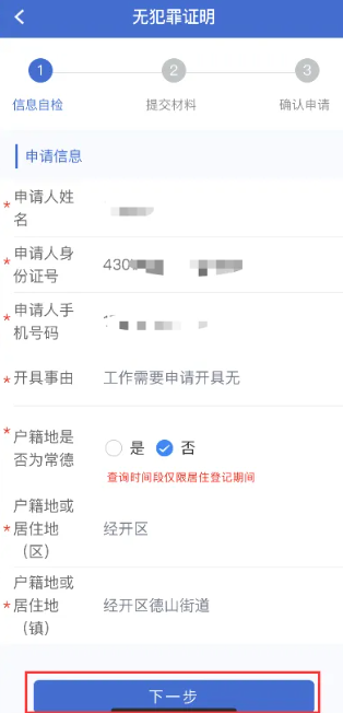 当户籍地是否为常德为‘是’时,第二步申请材料只需提交身份证;为‘否’时除身份证外还需上传居住证明,且查询时间段仅限居住登记期间