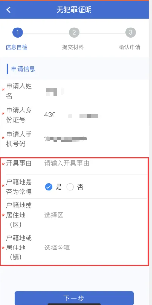 ③填写开具事由,并选择户籍地或居住地地址