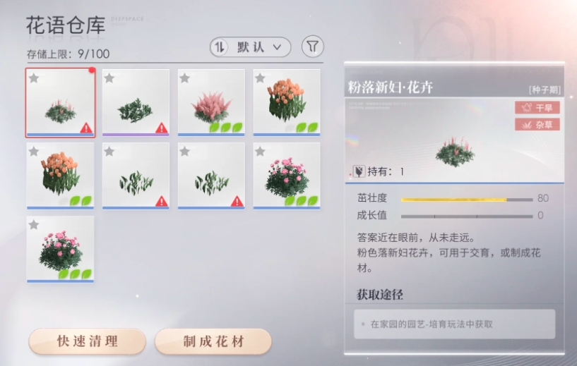 如果花只差一点就会成熟(浇花除草灭虫),但精力值不够,可收入仓库中,等到精力值够的时候,再种植(种植时,点【花卉】从里面挑你想种的)。建议成熟的花变成花卉,花材有保质期,会过期。另:【花语仓库】可看见花的状态