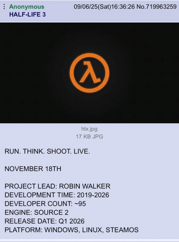 爆料者称,《半条命3》将于11月18日公布,2026年第一季度发售,采用起源2引擎开发。游戏将会登陆Windows、Linux和SteamOS。