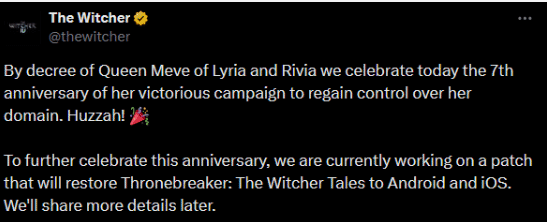 据PlayGround最新报道,为庆祝《巫师之昆特牌:王权的陨落》发售七周年纪念,CD Projekt RED工作室正推进该作重返移动平台的相关工作。