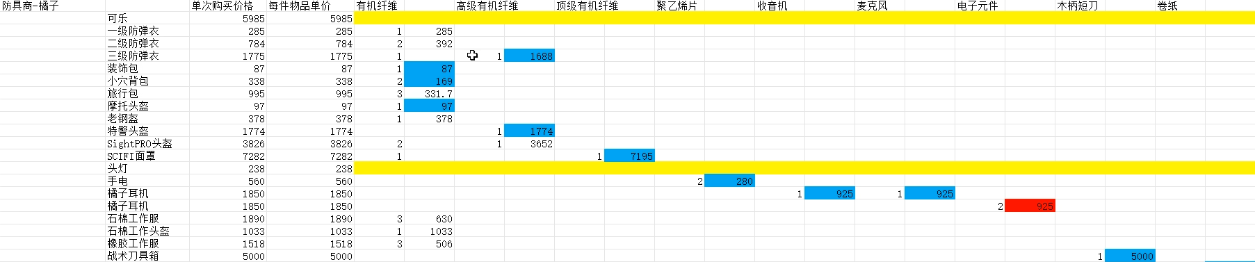 防具分解与购买一览表
