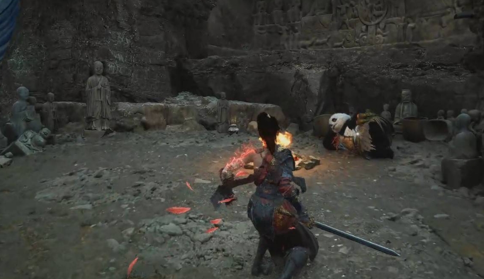 洞穴里找到熊猫与其对话,可以用竹笋交换武器【神火长枪】。