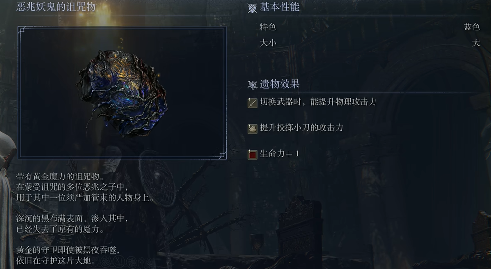 将其击败后,玩家坐到这里的下面冒着金色的椅子上,即可触发后续的剧情,同时可以获得遗物【恶兆妖鬼的诅咒物】