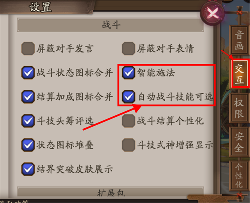 2、在头像面板上选择交互,在交互页面中将战斗一栏中的智能施法和自动战斗技能可选勾选上。
