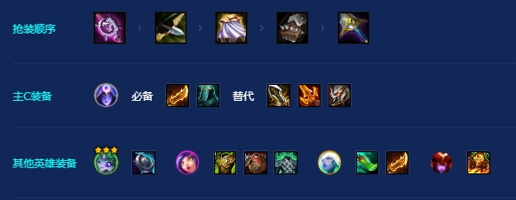 奈德丽:鬼索的狂暴之刃、水银、锐利之刃/泰坦的坚决/无尽之刃;妮蔻:狂徒铠甲、棘刺背心/巨龙之爪;其余的装备给希瓦娜,伊莉丝胡的话也可吃法强装。