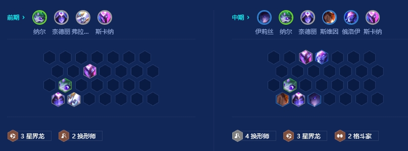 前期只拿需要的牌,连败开局,一定注意留三星界,利用星界龙特性可以更好的追出三星奈德丽。