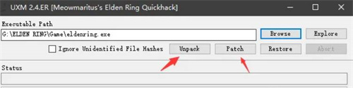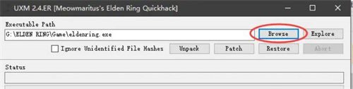1、首先下载UXM_2.4.ER_EldenRingQuickhack.rar,解压后运行UXM.exe,点击browse选中老头环的启动程序eldenring.exe。