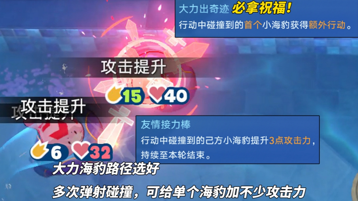 ①使用大力海豹尽可能多的碰撞橡胶海豹,为其叠加攻击力,若是技术到位可依靠反弹等操作增加碰撞次数,尽可能多的叠加攻击力。必拿祝福大力出奇迹‘首次命中的海豹可额外行动’,让橡胶海豹1轮2动,叠加更夸张的攻击力~