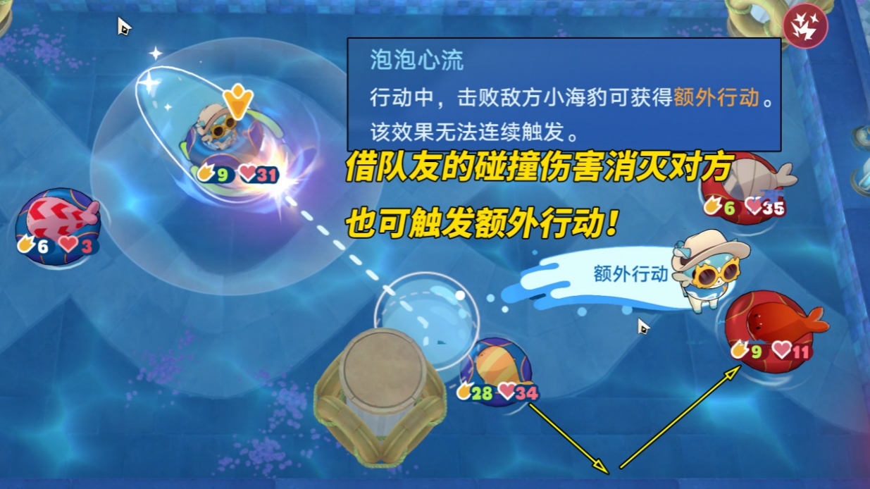 ③最后用奇美拉泡泡收尾,通过撞击前面已叠加高额攻击力的橡胶海豹来攻击敌方,可让敌方扣血更多。只要在泡泡的行动中,无论是通过队友碰撞还是其他方式击败敌方,都可触发额外行动,可再动1次。