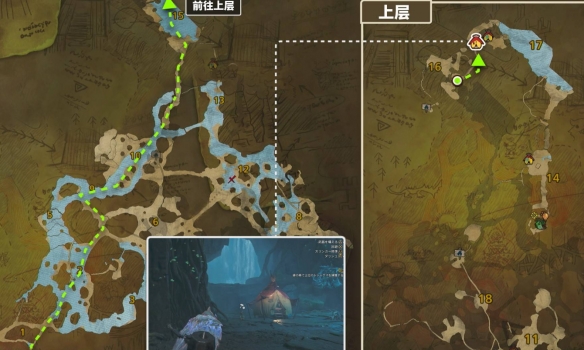 区域16可以通过下图所示路线前往。区域16位于区域15悬崖底部的洞窟深处,不需要到达悬崖上方。