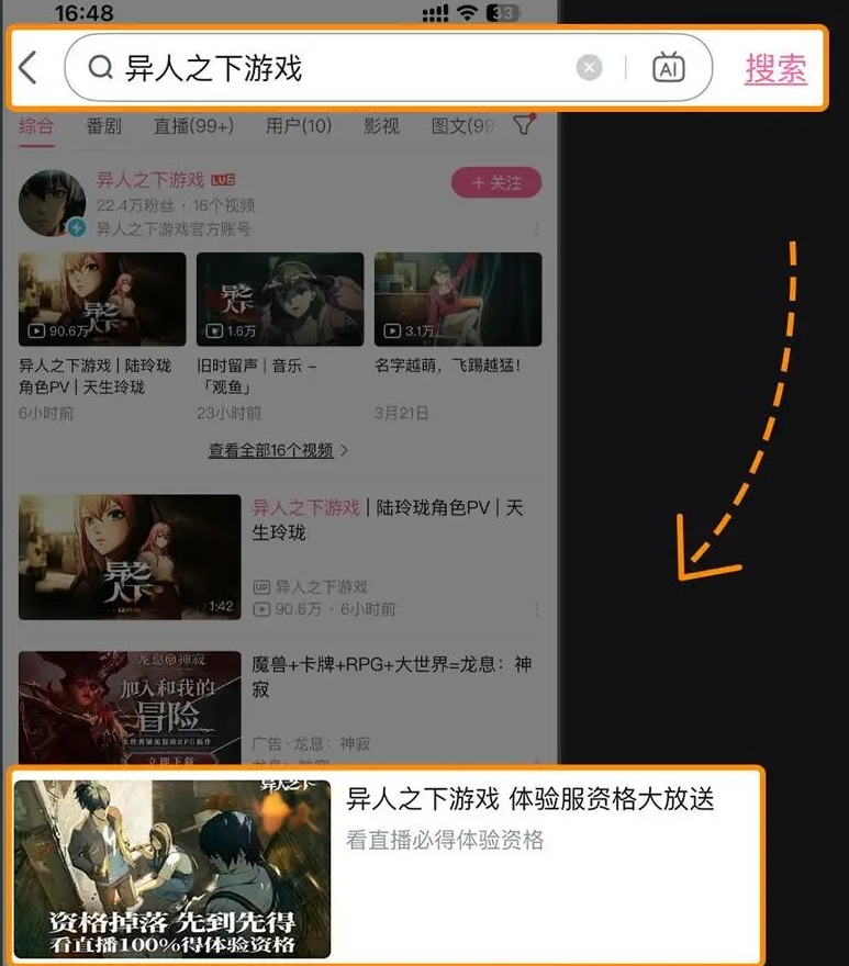 Step 1:搜索异人之下游戏进入活动页面在上述平台搜索“异人之下游戏”,在结果栏中找到『看直播掉资格活动』进入活动页面