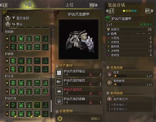 在打完护凶爪龙后做头、腰、手三件套,自带连击技能,与铳枪相性不错,但需要消耗一个逆鳞,这个东西不好出
