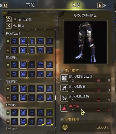 护火龙需要的护火龙的逆鳞比较难打,如果打不出来可以考虑替换成机械护腿或者冻峰龙腿