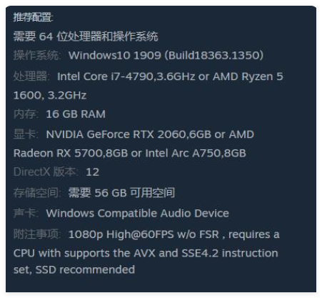 附注事项: 1080p High@60FPS w/o FSR , requires a CPU with supports the AVX and SSE4.2 instruction set, SSD recommended