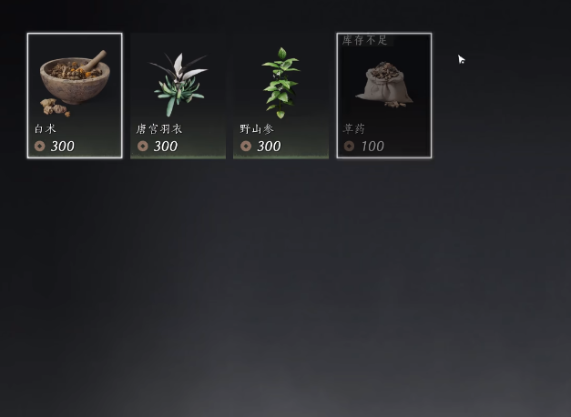 唐宫雨衣、白术、野山参都是买300铜钱,如果在外面的买要800。