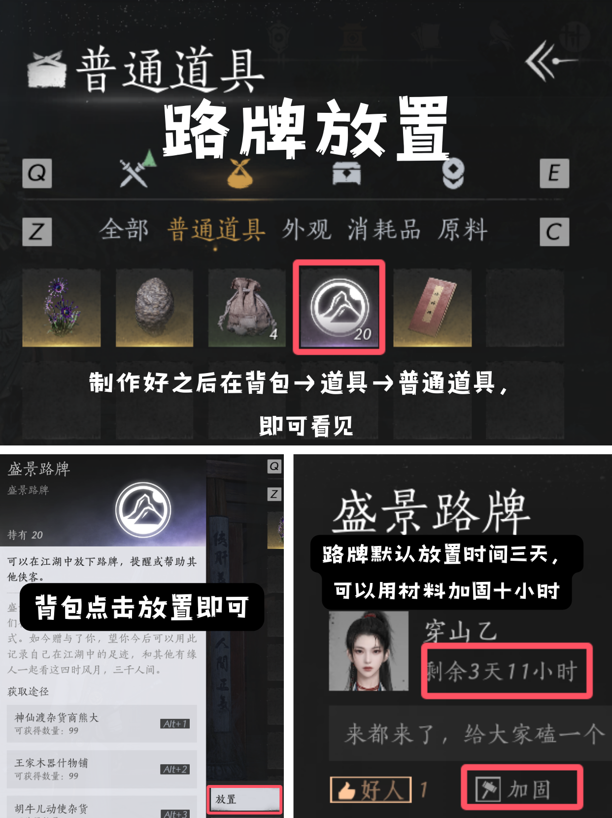 常规路牌的放置时间为3天,也可以加固路牌,加固可以增加10小时的有效时间