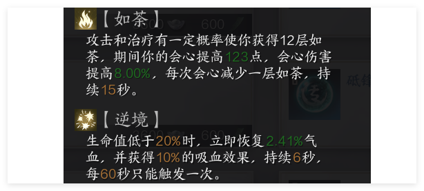 2、在剑青自身高会心高会伤的加持下那么这个【如荼】的加入就非常的有好处了。