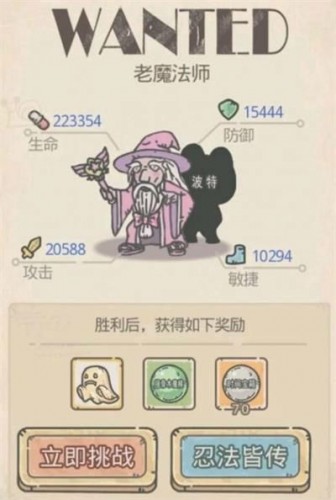 装备:胡桃木魔杖(生命+100攻击+50防御+10追击+10,火水土风元素伤害+30)、时间宝箱碎片60、绿贵(魔法学院徽章:攻击+60、挑战黑魔王,蜗牛生命+50000,防御+5000,对黑魔王伤害+1000%)。老魔法师灵魂(8h)、绿贵(死亡圣器Ⅶ:供奉灵魂时,供奉速度+1.2%。挑战黑魔王,蜗牛攻击+5000,追击+5000,对黑魔王伤害+2000%)、时间宝箱碎片200。(伙伴:丰田次郎事件)