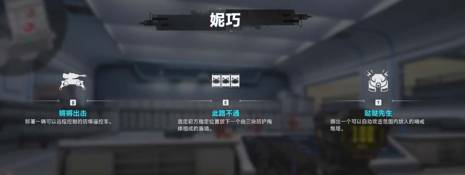 1、1技能 锵锵出击:部署一台可以远程遥控的防爆遥控车。小车有200血量,可以攻击敌人,命中会造成20点伤害,也可以用于探路或者是清理敌人的道具。