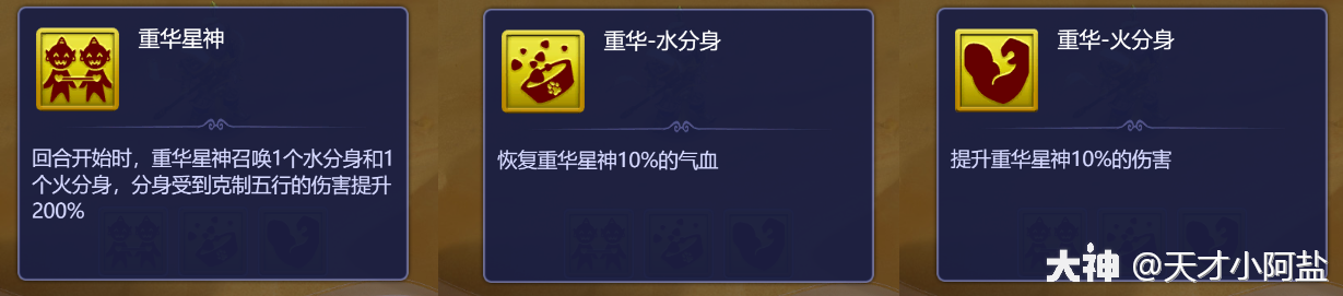会召唤水分神和火分神,分别恢复气血和伤害。