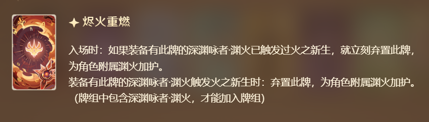 装备有此牌的深渊咏者·渊火触发火之新生时:弃置此牌,为角色附属渊火加护。