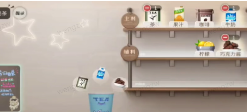 3、第三个顾客需要的是可可奶茶:一个茶、一个牛奶、一个巧克力酱。